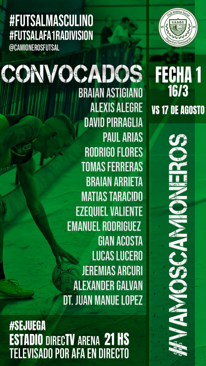 Desde las 21 horas en Pilar, CAMIONEROS, enfrentará a 17 de Agosto por la fecha inaugural del Futsal Argentino. Aquí los convocados por el técnico Juan Manuel López.