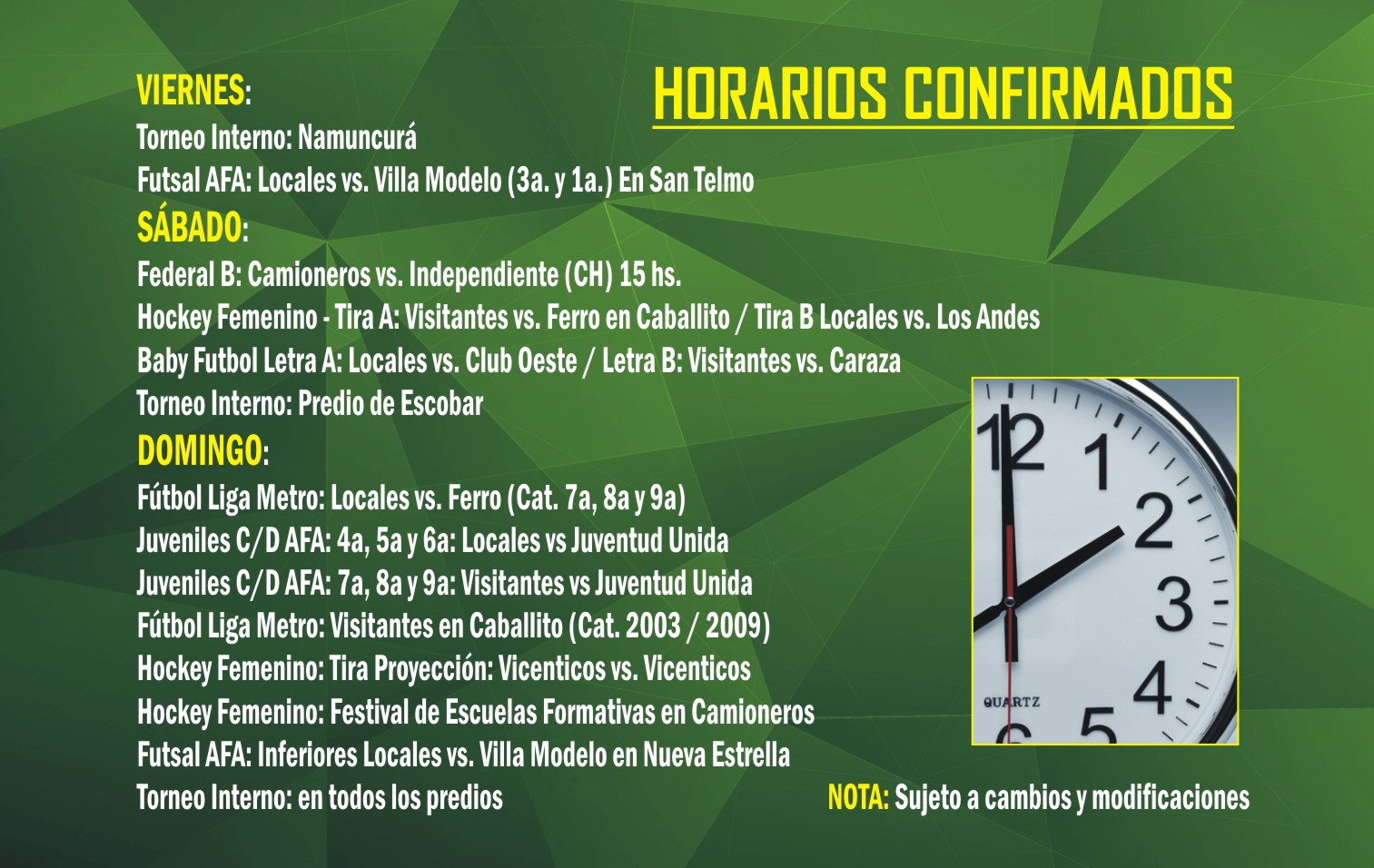 Vamos actualizando EL TABLERO DEPORTIVO de algunos horarios de las distintas disciplinas de CAMIONEROS para el FIN DE SEMANA, si el tiempo acompaña.