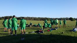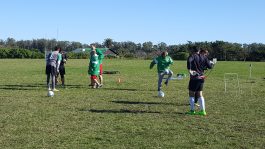 Mientras bordeábamos la Rambla y la olas rompían con fuerza, el micro de Camioneros, patente ISC 529, se metía pasadas las 9 en Parque Camet, girando casi hasta la salida. Ahí, donde estaba más parejito y seco, todo los componentes comenzaron a bajar los elementos a utilizar: barras, pesas, aros, conos, cintas etc. De que se trató el entrenamiento: Primero una entrada en calor, con diversos juegos, para incentivar el buen clima reinante. Tras cartón, estiramiento, y tareas relacionados con el fortalecimiento muscular, consitente en levantamiento de pesas, saltos varios, acción y reacción