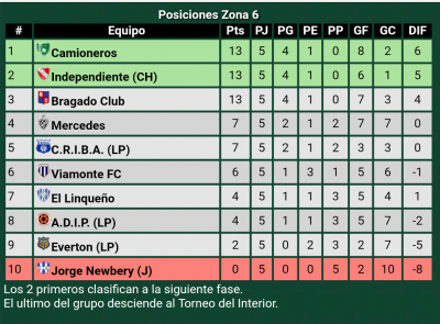 Posición: (1) El equipo de dirige Guillermo Calleri está ubicado en la 1ª. posición en la tabla junto a Independiente y Bragado.