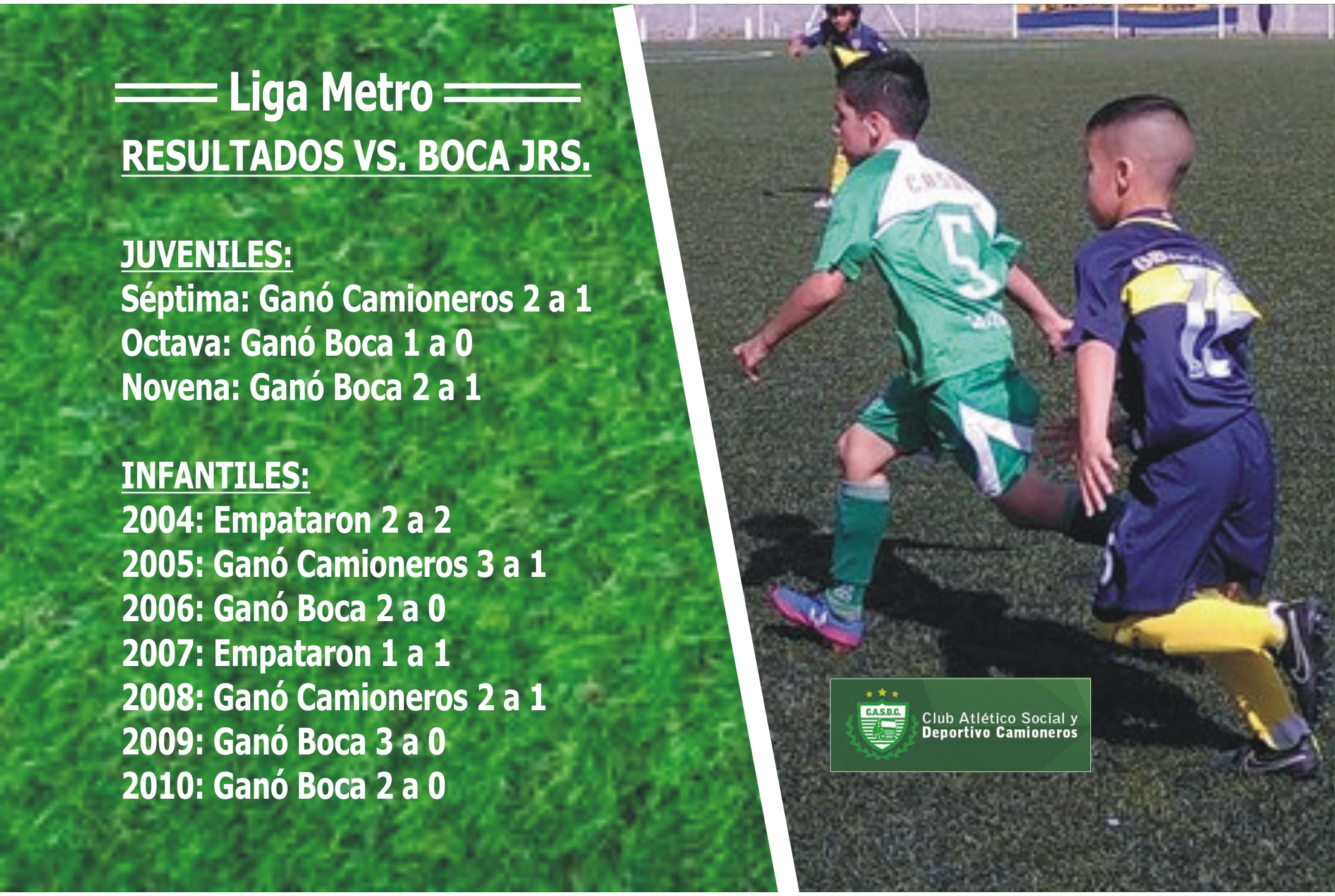 Un día espectacular para disfrutar del fútbol de Camioneros, nada menos que frente a Boca. Una producción excelente de nuestra institución, que juega hasta la 2008 por los «porotos» y 2009/10 juegan promocionales. Aquí destacamos cada partido que nos hace sentir que estamos por el camino correcto, felicitando a todos los que de alguna manera u otra participan de la actividad.