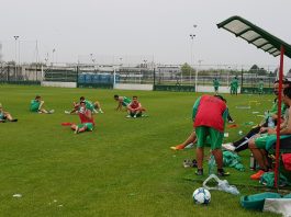 matizadas con juegos sobre la mitad de la cancha y en los laterales. Una fórmula de hacer ameno y poco rutinario los comienzos de trabajo. Luego de ello el cuerpo técnico procedió a armar dos equipos y recibir indicaciones acerca de que rol cumpliría cada uno en el partido de práctica. Así con remeras Rojas y Verdes hicieron