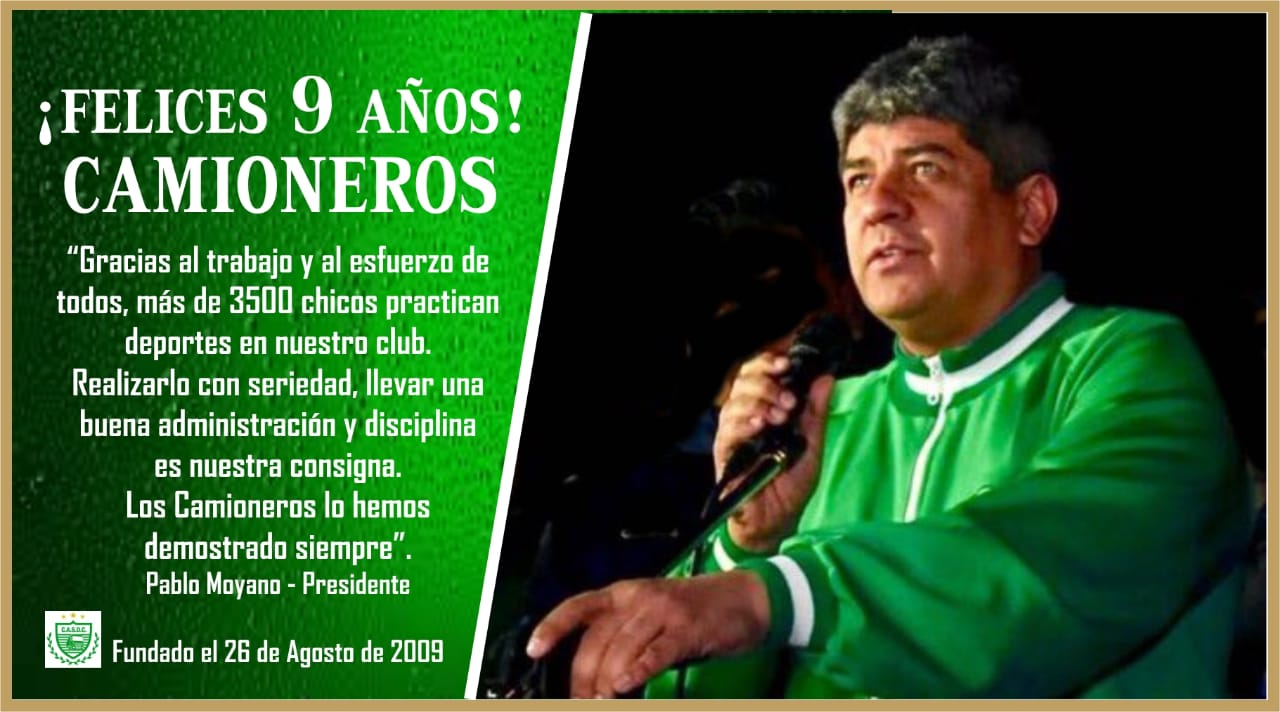 (00.01 Hs.) Hoy el Club Atlético Social y Deportivo Camioneros cumple 9 años de vida. La idea base de crear un espacio de esparcimiento, inclusión y desarrollo para los afiliados, que surgió en el contexto de los proyectos de desarrollo que lleva a cabo CAMIONEROS de la mano de HUGO y PABLO MOYANO. En Agosto de 2009, lo que había arrancado por los torneos de fútbol interno y a posteriori la participación en la Liga Lujanense de Fútbol con el nombre de Mutual, se transpoló oficialmente en club. Y allí empezó un desarrollo descomunal tanto en las distintas disciplinas que se fueron sumando, como así también en lo edilicio, siempre pensando en la Función Social, ayudando a crear un ambiente de paz, fomentando la vida sana y el deporte, sin límite de edad. Desde la práctica de Yoga para los más grandes hasta categorías infantiles en distintas disciplinas, teniendo una ilusión al entender que formaban parte del club con un importante sentido de pertenencia y de ese modo olvidar las dificultades y el difícil entorno que les rodea en ésta época. Pero además la práctica del deporte potenciaría entre los jóvenes de la zona valores como el compromiso, la solidaridad, el amor propio, la autoestima y el deseo de superación, todos ellos valores muy necesarios en una sociedad tan castigada por los continuos vaivenes sociales. A lo largo de las últimas décadas hemos visto como los diferentes flagelos como la delincuencia, drogas, robos y carencias llamaban a sus puertas; asi en cada familia se puede encontrar a alguien que de forma directa o indirecta ha sido afectada por la crueldad de éstas. De modo que la mayoría de los niños y jóvenes deben enfrentarse con demasiada frecuencia a situaciones traumáticas en el seno de sus comunidades o de sus propias familias. En este ambiente de problemas y necesidades acuciantes, los jóvenes y niños también tienen derecho a soñar con ganar o ser campeones de algo y de llegar un poco más lejos en el día a día tan difícil de sus vidas, olvidando tantas vicisitudes y miserias. Por eso, CAMIONEROS, abierto a toda la comunidad, sin cobrar cuota u arancel alguno, incluyendo traslados, indumentaria, con Comedores Infantiles, asistencias psicológicas, médicos, kinesiologos, preparadores físicos, técnicos, personal auxiliar y dirigentes siempre dispuestos a acercarse, ¡A TODOS ELLOS FELICIDADES!: son los pilares fundamentales de ésta institución que se ganó un lugar por la “Prepotencia del Trabajo” y que día a día va por más. ¡FELICIDADES CAMIONEROS QUERIDO!, y la historia recién comienza…