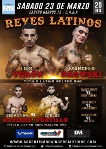 El campeón latino superligero OMB, el rosarino Sebastián Aguirre (16-3, 10 KOs), se enfrentará al pegador paraguayo Carlos “Carpi” Portillo (22-1, 17 KOs), intentando defender por primera ocasión su corona.