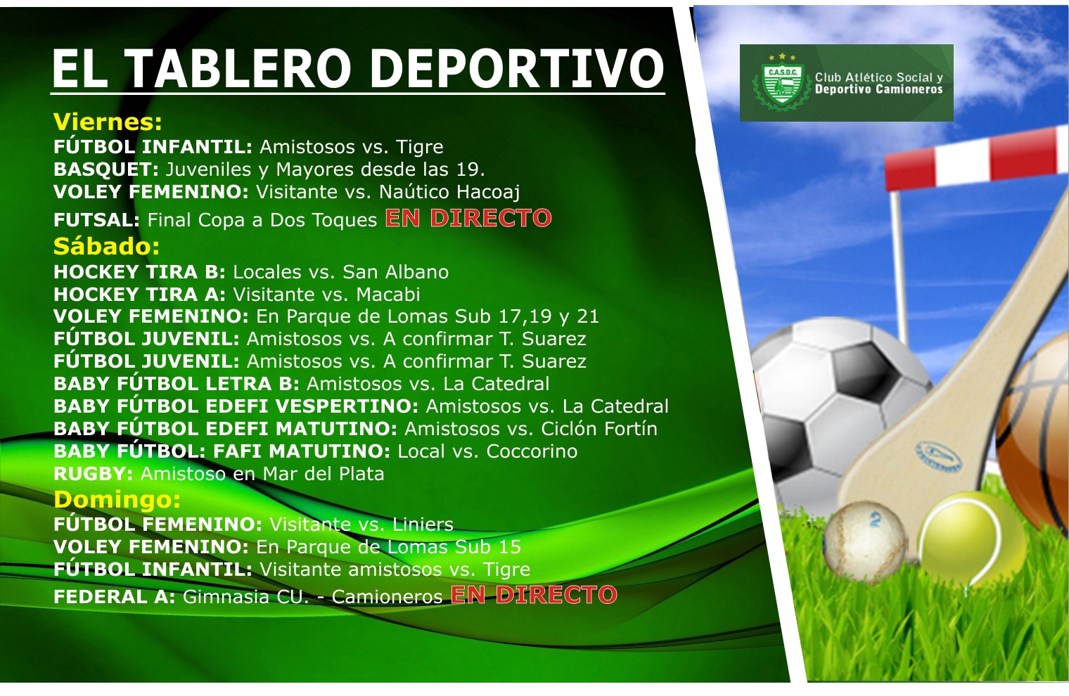 Otro fin de semana que promete estar cargado de emociones. Miles de deportistas de CAMIONEROS diseminados a lo largo a lo ancho del país, representando a nuestra institución. Por eso te presentamos los días, horarios y disciplinas para que estés bien informando.