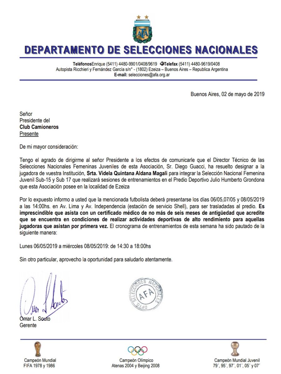 Mientras se repone de una fractura en uno de sus dedos, la juvenil arquera de CAMIONEROS, MAGALÍ VIDELA, fue nuevamente citada para intregrar los planteles de la Selección Argentina que practica en el predio de Ezeiza. la portera del verde realiza trabajo de kinesiología buscado su mejor estado para defender los colores Argentinos. ¡Orgullo Camionero!.