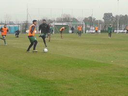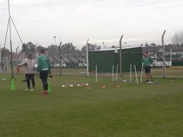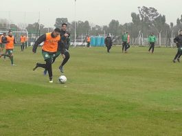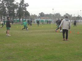 Ya está. Atrás quedaron los meses de larga espera, de la explosiva tarea aeróbica, el contraste de los ejercicios de fuerza y velocidad. Ahora es el tiempo del FÚTBOL propiamente dicho, de los ensayos y de la puesta a punto. Hoy se trabajó en ejercicios con pelota manteniendo la intensidad, mientras en otro sector, los arqueros Gómez, Cottone, Guarracino trabajaban a un costado del campo de juego y lo hacían con Alejandro Rocha. Mañana efectuarán un amistoso con Los Andes buscando la mejor puesta a punto. Al término del entrenamiento dialogamos con JUAN NAVARRO.