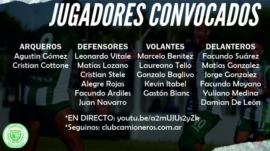 El técnico de #camioneros, ABEL ALVES, convocó a éstos 19 futbolistas para enfrentar a Huracán Las Heras, el Domingo desde las 17 hs. en el Estadio Hugo Moyano.