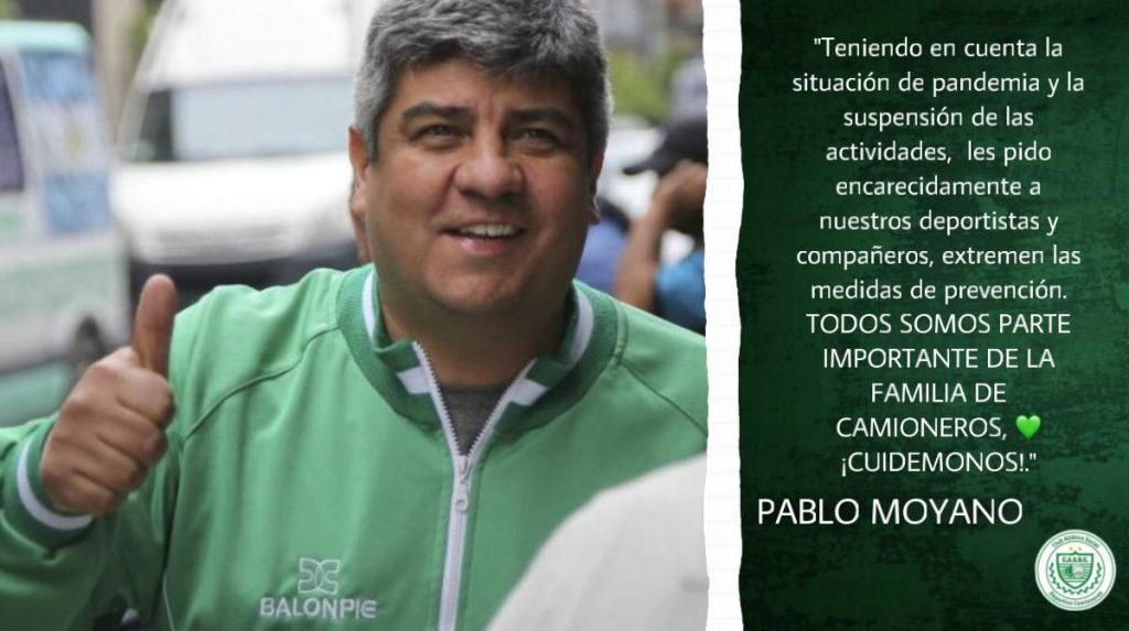 Pablo Moyano «Teniendo en cuenta la situación de pandemia y la suspensión de las actividades, les pido encarecidamente a nuestros deportistas y compañeros, extremen las medidas de prevención. TODOS SOMOS PARTE IMPORTANTE DE LA FAMILIA DE CAMIONEROS, ¡CUIDEMONOS!.»