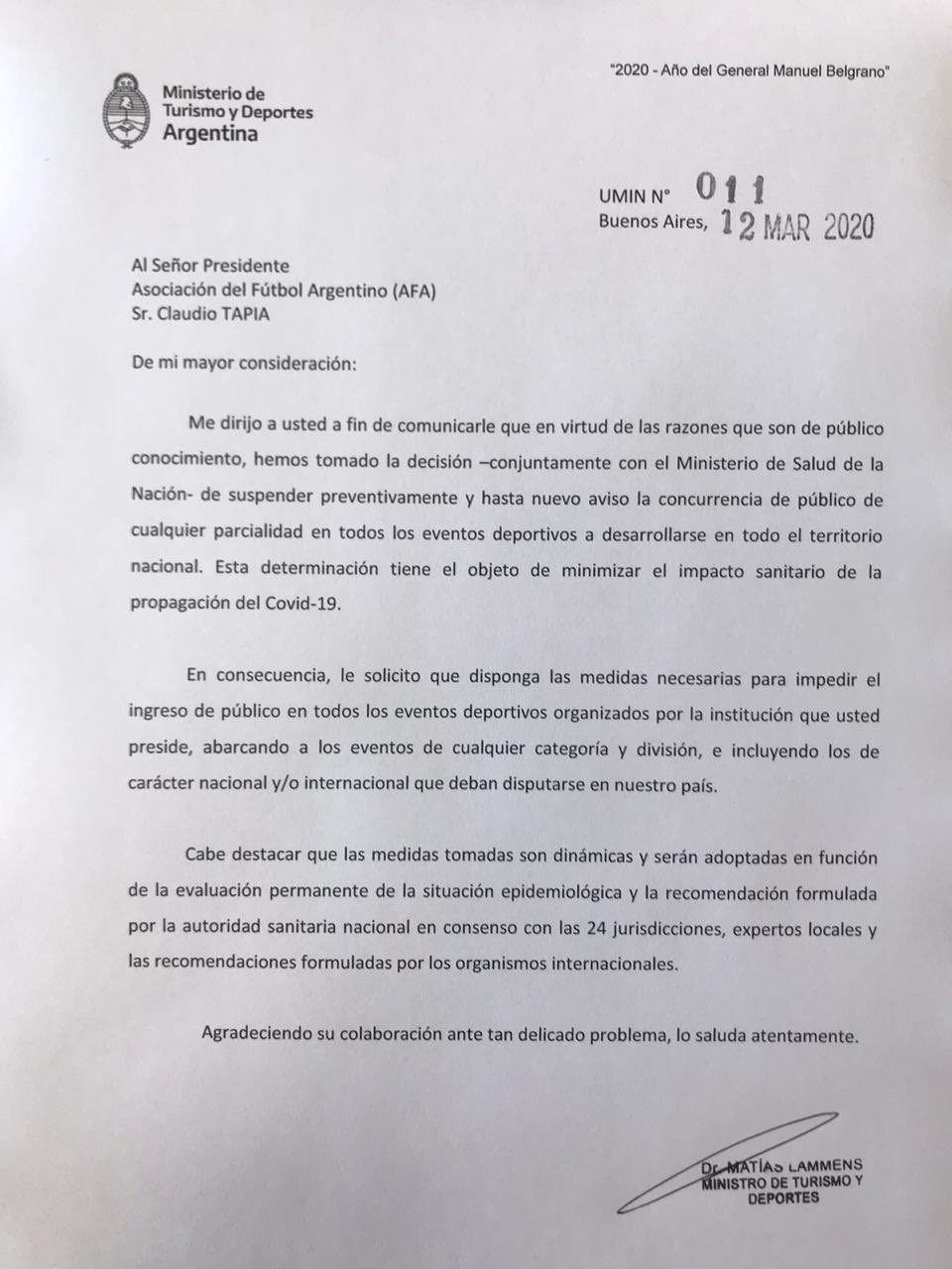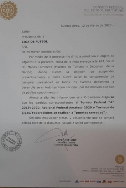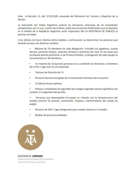 Comunicados emitidos hace instantes, en donde hace referencias que, por los hechos que son de dominio público, todos los eventos deportivos a lo largo y a lo ancho de Argentina se desarrollarán, hasta nuevo aviso, a puertas cerradas… Aquí el texto.