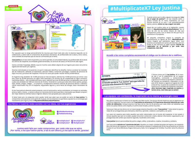 El proyecto Casa Justina, liderado por Ezequiel Lo Cane y el Equipo de NO+HAMBRE ARGENTINA, nació a partir de la promulgación de la Ley Justina, impulsada a raíz de la experiencia de su hija. La iniciativa busca mejorar el proceso del trasplante de órganos, concientizar sobre su importancia y contener a quienes lo atraviesan. Será un lugar de ayuda y compañía, donde se puedan compartir experiencias tanto de éxito como de pérdida, para crecer y avanzar en comunidad.