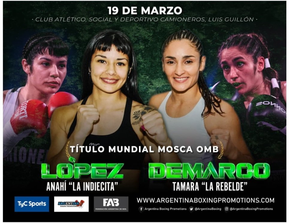 Una pelea de título mundial, con una de las más destacadas del planeta frente a una férrea rival. La campeona mundial mosca de la Organización Mundial de Boxeo de Boxeo (OMB), la invicta juninense Anahí “La Indiecita” López, se enfrentará a la ex retadora mundialista bonaerense Tamara “La Rebelde” Demarco, intentando defender por segunda ocasión su corona, en el combate estelar de la velada que se desarrollará este sábado, 19 de marzo, en el Complejo Deportivo del Club Atlético, Social y Deportivo Camioneros, en Luis Guillón, provincia de Buenos Aires, Argentina, en una nueva producción de Argentina Boxing Promotions, de Mario Margossian, que será transmitida en vivo a través de TyC Sports a partir de las 23:30, para Argentina y toda América en su ciclo Boxeo de Primera. TyC Sports Play iniciará a las 20:45 con Boxeo de Primera Promocional.