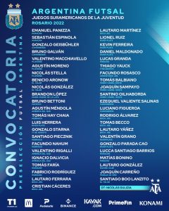 cancha desde arquero hasta llegar ser pivot o ala. Jugador que lleva el futsal en la sangre, y tuvo la suerte de poder jugar con sus hermanos en la Copa Argentina 3ra. división 2021. Campeón en 2017 (7ma.) y 5ta en 2018. “es un sueño a cumplir ponerme la ropa de la selección, muy ansioso y con muchas ganas de empezar para dar lo mejor; primero que nada se lo dedico a mi familia, a mis profesores del club que me enseñaron muchas cosas, a los coordinadores y a toda la gente del club que siempre está para nosotros. Y todos los pibes del barrio, a ella.