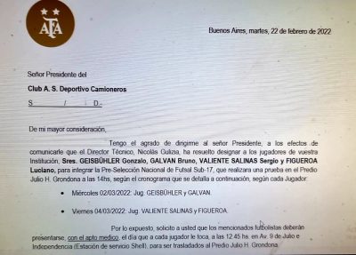 Surgidos y captados por Camioneros, Luciano Figueroa, Ezequiel Valiente Salinas, Gonzalo Geisbhuler y Bruno Galvan fueron citados para la pre-selección Sub 17, con vistas a los juegos Sudamericanos Rosario 2022. Juegos que se desarrollarán entre el 5 al 8 de Mayo y donde en éste primer llamado tiene 45 citados, para luego llegar a 18 jugadores para terminar con 10 que serán los seleccionados que representarán a Argentina. Los entrenamientos son en el predio de AFA.