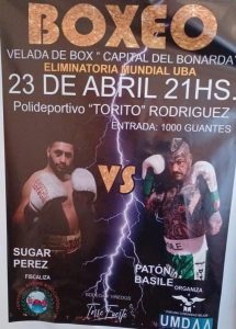 – Es una pelea en Mendoza, frente a un rival «Bicho» «Chúcaro» que viene de Mediano a Super mediano y subió a pesado. Y el que venza peleará por el título del Mundo de la UBA. Es un organismo reconocido por la FAB con Sede en Panama, Puerto Rico, EE.UU.