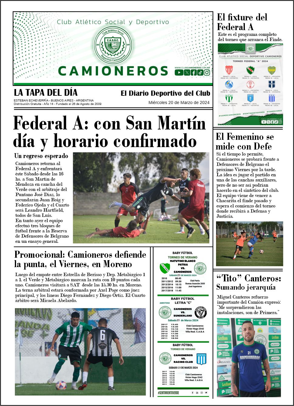 CAMIONEROS CRECE: Además de la activación cada 30′ informando sobre todas las actividades del club, sumamos el boletín de cancha, ahora anexamos LA TAPA que incluye los títulos más importantes de todo aquello que vamos compilando.