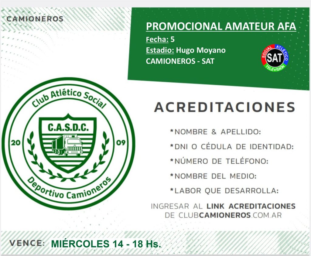 Queda abierto el período de REGISTRO para el encuentro por la fecha 5 del Clausura: Camioneros y SAT.