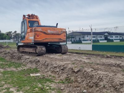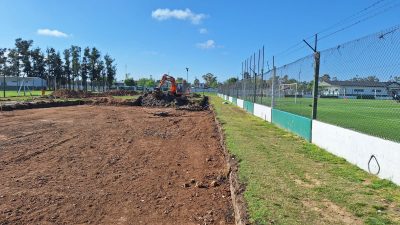 que denominamos ‘cancha’ se extiende por 74 metros de largo x 15 metros de ancho, que es donde primero se hará la ‘platea’ (se denomina así a la base plana de cemento) que va a sostener las columnas de la tribuna. Primero se hace una platea de hormigón, quedan los ‘pelos’ (los hierros que sobresalen), las columnas y luego comienzan a levantarse esos cajones. Será a 80 cm. del piso y tendrán 15 escalones…