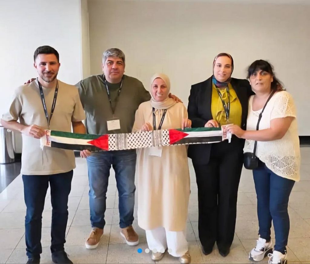Pablo Moyano intercambio la situación de cada uno de los países con las compañeras Mahera y Holovani del Frente Nacional de Trabajadores de Palestina.