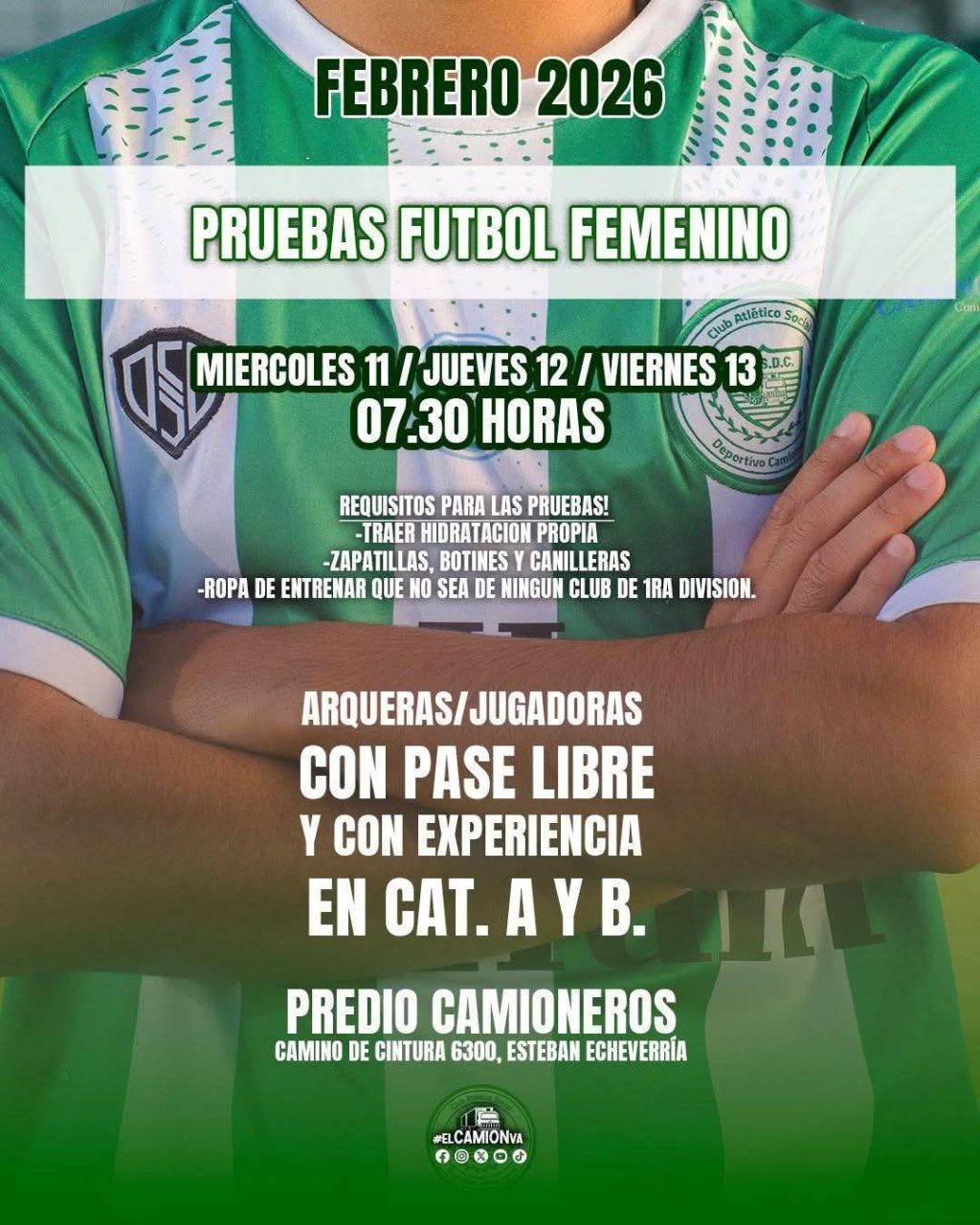 FÚTBOL FEMENINO PRUEBAS DE JUGADORAS EN EL FÚTBOL FEMENINO 9 febrero, 2026 En CAMIONEROS tenemos un lugar preparado para vos…