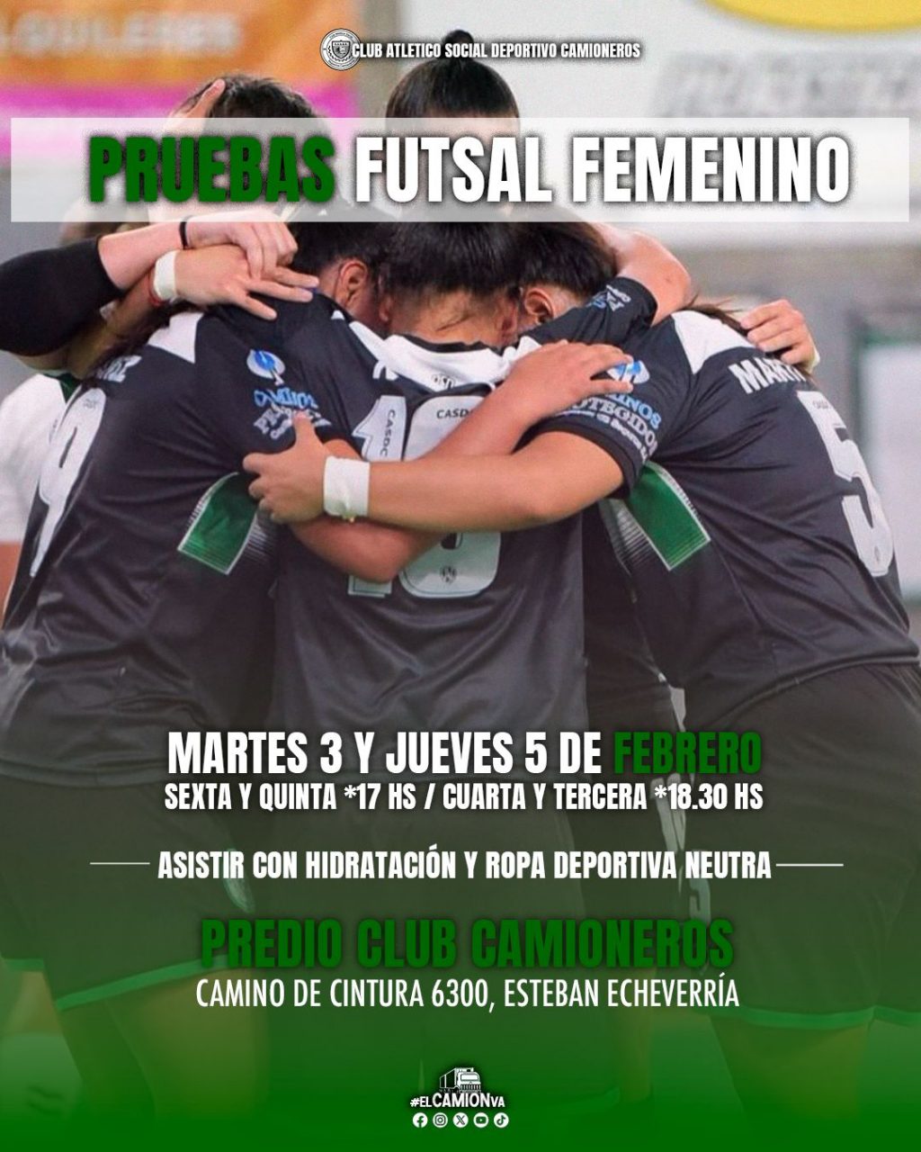 FUTSAL PRIMERA DIVISION PRUEBAS EN EL FUTSAL FEMENINO 1 febrero, 2026 Vení a jugar a Camioneros… Hay un lugar preparado para vos.